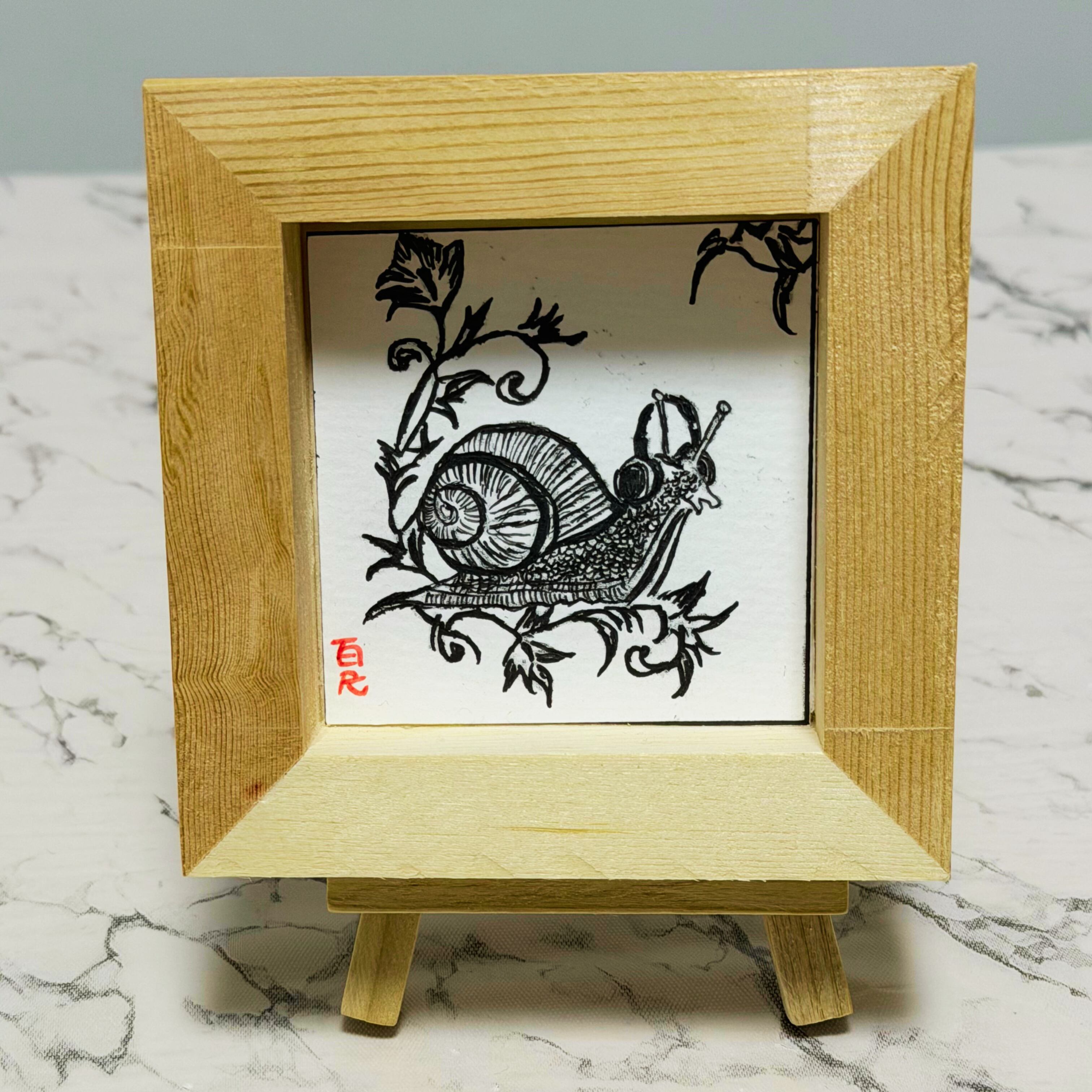 “唄う”から“聴く”への変化をテーマに、ヘッドフォンを身につけたカタツムリを繊細なペン画で表現しました。